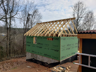 It's been pretty rainy lately and I've discovered that I'm a fair weather builder. But today, there was some clear, warm weather and I finished putting up the last of the rafters.